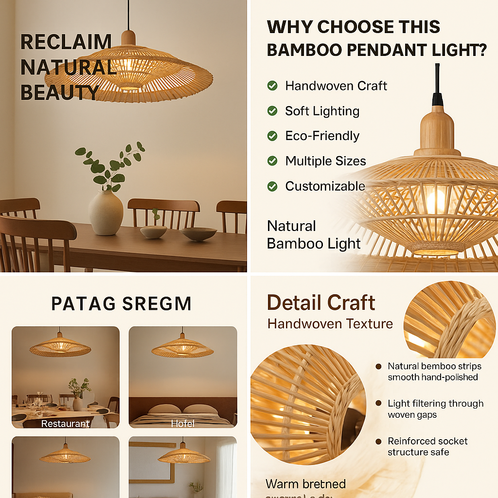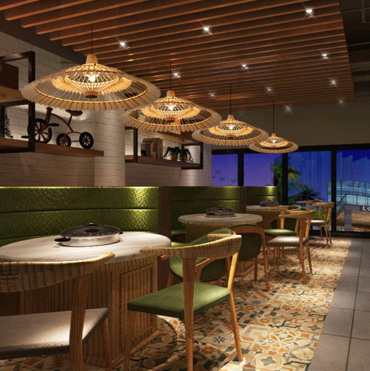 This handwoven bamboo pendant light features a traditional Asian hat design, perfect for adding a natural and serene aesthetic to your home, dining area, or café.