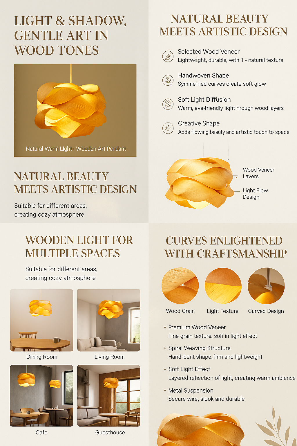Elegant twisted wood veneer pendant lamp for modern interiors. A warm, sculptural lighting piece for dining and living areas. Hand-assembled from natural materials.