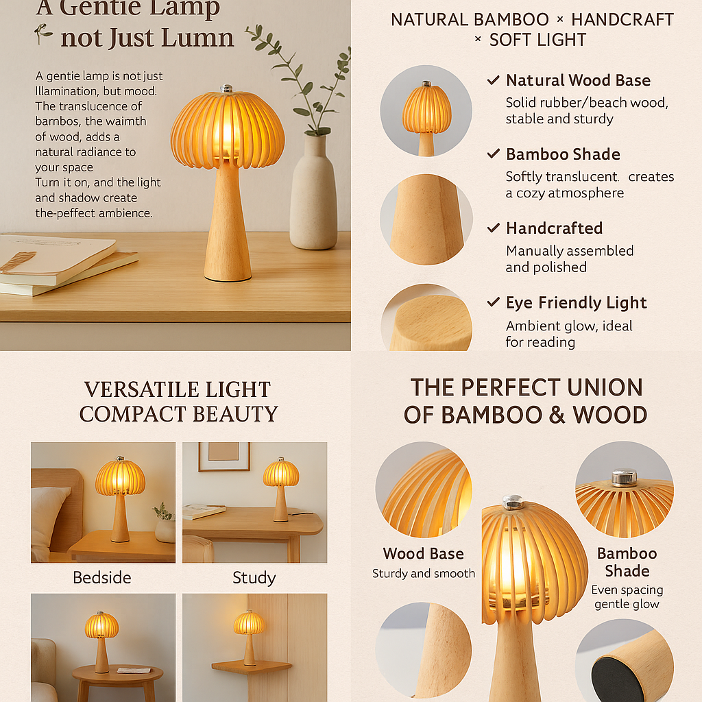 • Unique Feature: Wooden base with bamboo ribbed shade