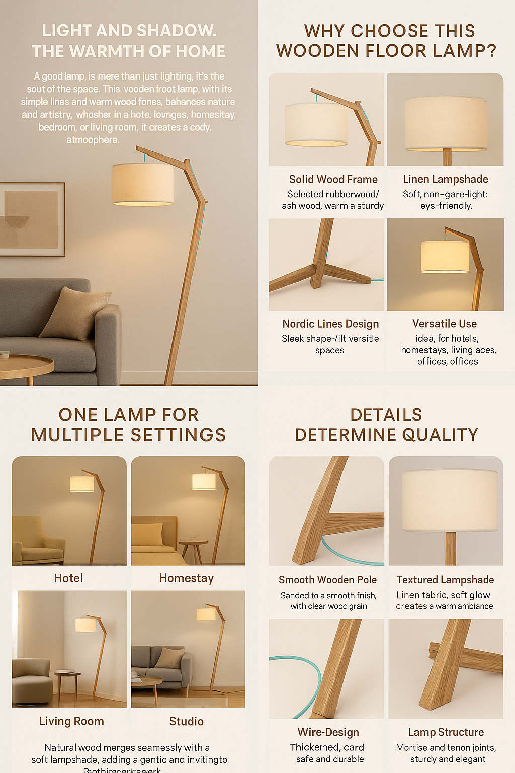 This modern floor lamp features a solid wood frame and a soft fabric lampshade, making it ideal for hotels, B&Bs, engineering projects, homes, and commercial environments. Elegant and functional, it brings warmth and aesthetic appeal to any space.