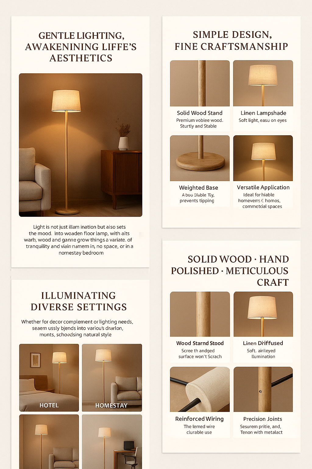 Solid Wood Floor Lamp – Minimalist Fabric Shade Standing Light for Home & Commercial Use