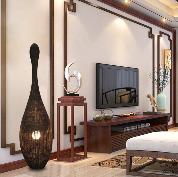 This elegant rattan floor lamp features a handwoven elongated teardrop design that brings organic texture and ambient warmth to any room. Perfect for modern eco-conscious interiors.
