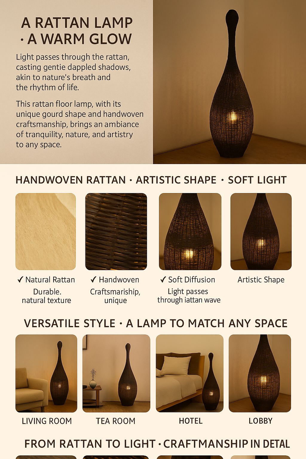 • Handwoven rattan floor lamp in an elegant tall shape. Perfect for bohemian and eco-style interiors, offering soft 360° ambient lighting with artistic texture.