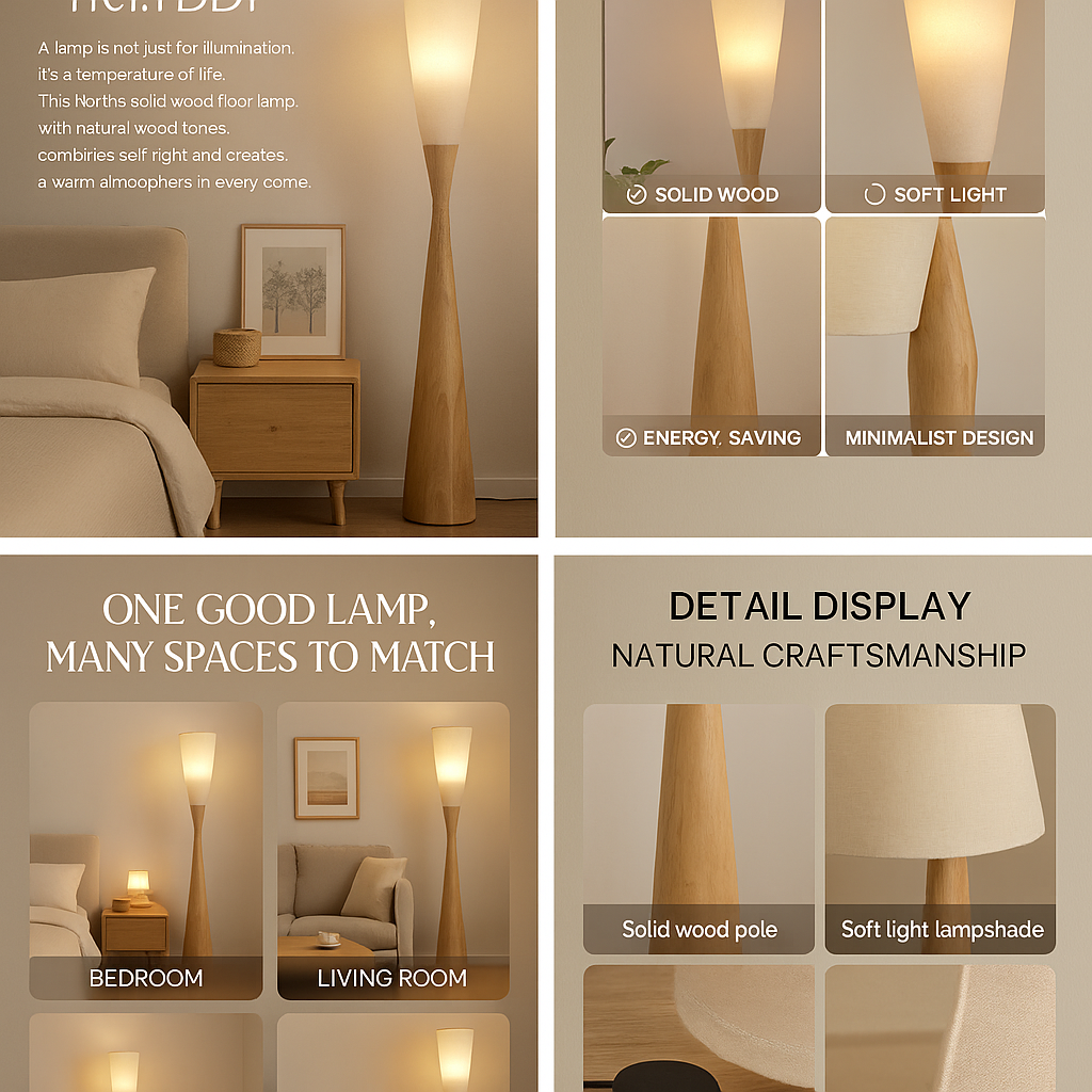 Discover our modern solid wood floor lamp featuring a minimalist design and warm ambient lighting. Perfect for living rooms, bedrooms, and cozy corners.