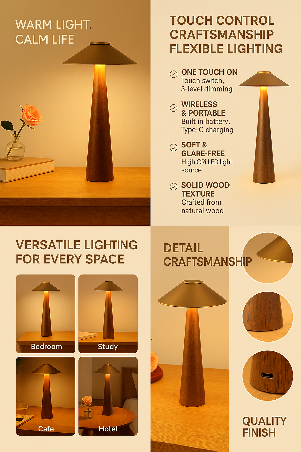 • Compact touch-control table lamp made with solid wood, offering warm ambient lighting. Ideal for bedrooms and modern interiors. Rechargeable and stylish.
