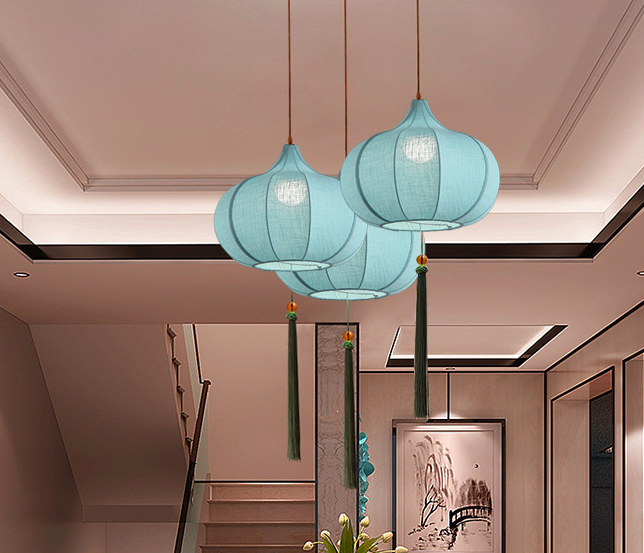 This pendant light features a classic Chinese lantern shape with soft blue fabric and elegant tassels. Perfect for restaurants, tea houses, entryways, or boutique interiors, it combines traditional aesthetics with handcrafted elegance.