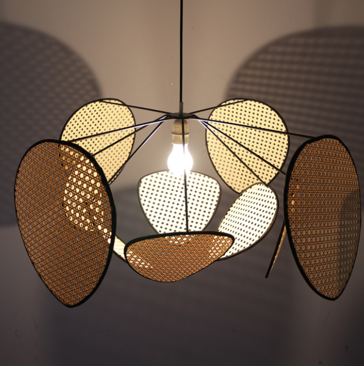 Leaf-petal inspired rattan chandelier handcrafted with eco materials. Perfect for bohemian interiors, cafes, studios and artistic home décor.