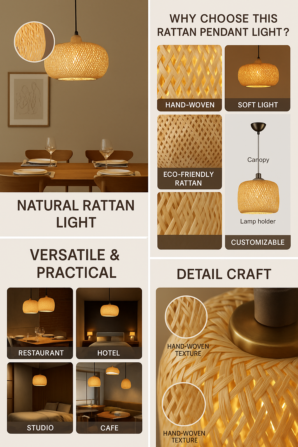 Handwoven drum-shaped pendant light made from natural rattan. Ideal for living spaces, bedrooms, or dining areas. Provides warm, cozy lighting and natural aesthetics.