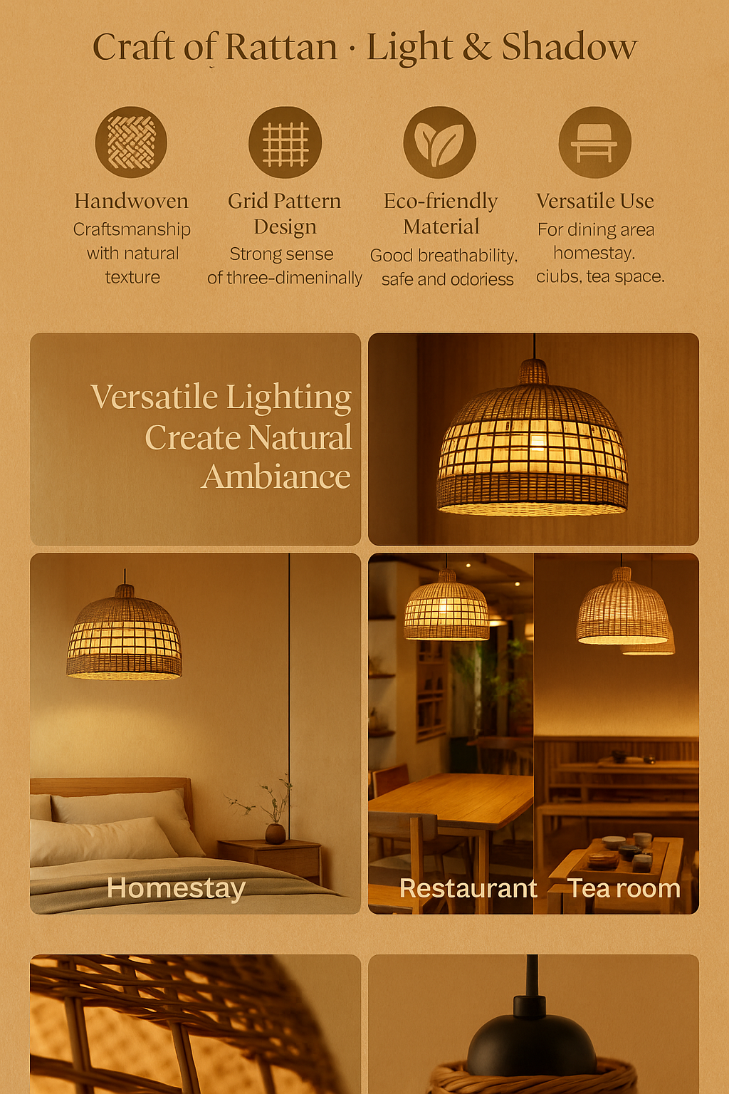 Natural handwoven rattan pendant light, ideal for dining rooms, cafes, and tea houses. Provides soft and cozy lighting with a decorative vintage charm.