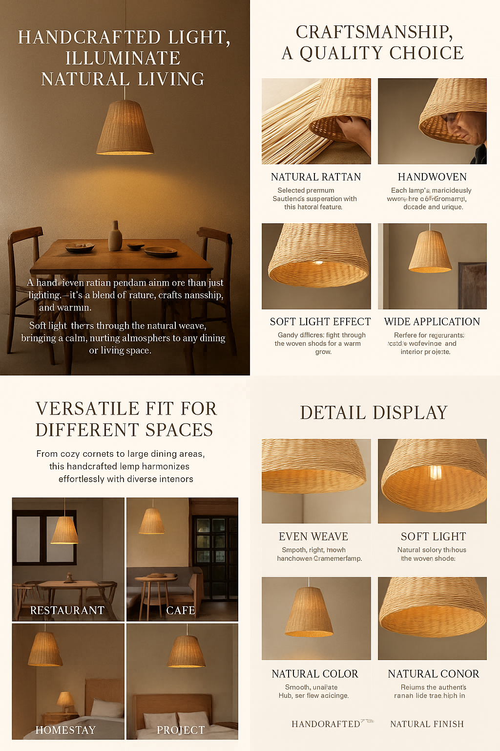 This handwoven cone-shaped rattan pendant light is ideal for cafés, restaurants, and home interiors. Features natural materials, cozy lighting, and a minimalist style.