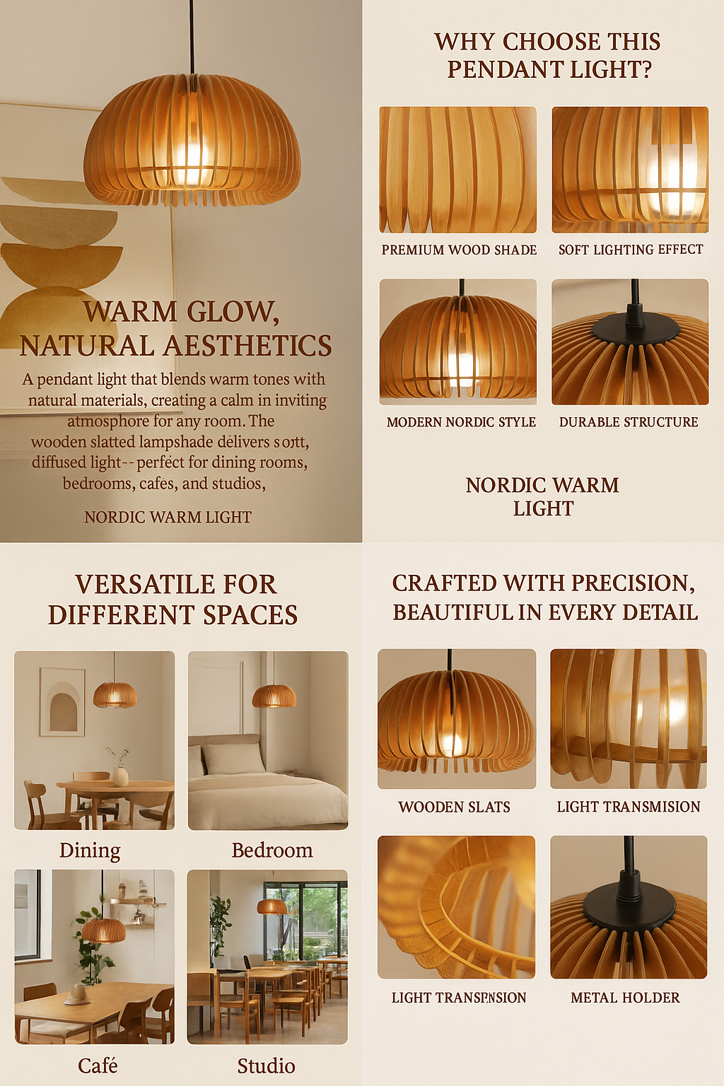This Nordic-style polywood pendant light features a warm, natural aesthetic with a slatted dome-shaped design. Ideal for dining rooms, kitchen islands, or cafes, it adds cozy elegance to any interior.